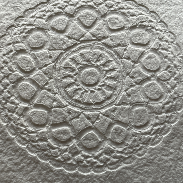Embossage d’un napperon dentelle sur une feuille de papier artisanale blanc de 14 x 21 cm. Format A5.