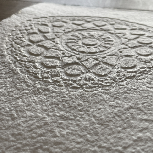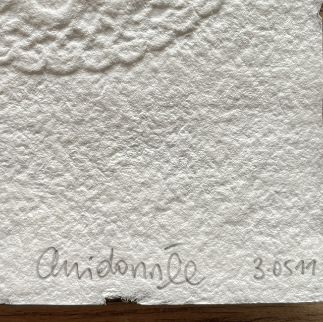 Je porte un nouveau regard sur l’objet avec l’envie qu’il laisse une trace, ses détails graphiques, les textures, comme une empreinte qui révèle des souvenirs. Un napperon posé sur du papier laisse une marque, une ombre, une dentelle en creux. L’embossage du napperon se fait en même temps que la fabrication de la feuille de papier. La fabrication artisanale d’un papier épais et tramé évoque aussi le tissu, la tradition du papier chiffon. On déplace l’objet du quotidien vers le champ artistique, Papier napperon suggère donc l’idée de ce qui reste après le geste, l’impression d’une mémoire textile sur une matière d’écriture.