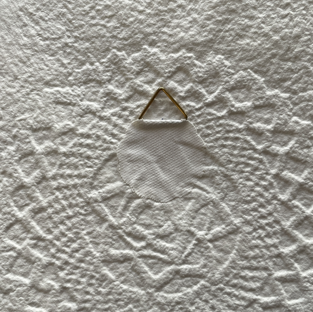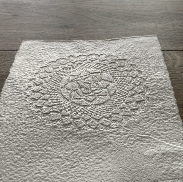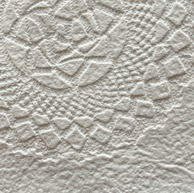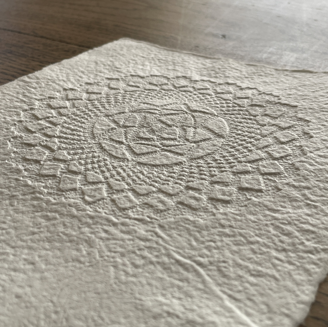Je porte un nouveau regard sur l’objet avec l’envie qu’il laisse une trace, ses détails graphiques, les textures, comme une empreinte qui révèle des souvenirs. Un napperon posé sur du papier laisse une marque, une ombre, une dentelle en creux. L’embossage du napperon se fait en même temps que la fabrication de la feuille de papier. La fabrication artisanale d’un papier épais et tramé évoque aussi le tissu, la tradition du papier chiffon. On déplace l’objet du quotidien vers le champ artistique, Papier napperon suggère donc l’idée de ce qui reste après le geste, l’impression d’une mémoire textile sur une matière d’écriture.