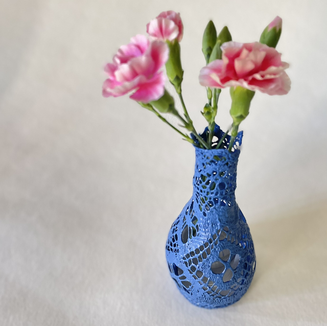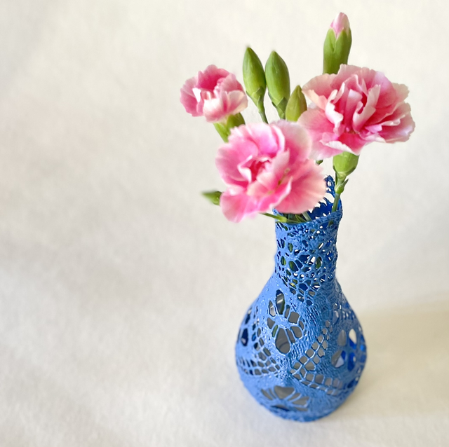 Décoration réalisée à partir d’un napperon durci et peint. Diamètre 8 cm, hauteur 18 cm. Pièce unique décorative, elle peut accueillir des fleurs séchées ou fraîches (Possibilité d’ajouter un contenant d’eau dedans) et également une petite guirlande led pour un effet féerique. Livré sans fleurs. Coloris bleu cobalt.