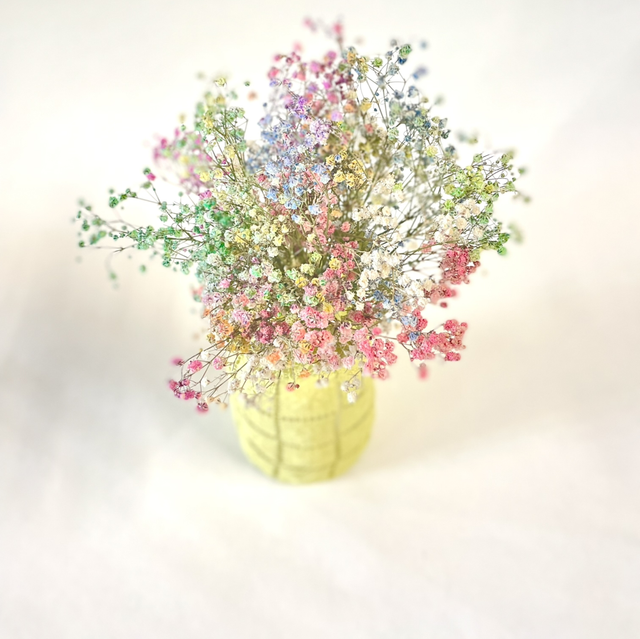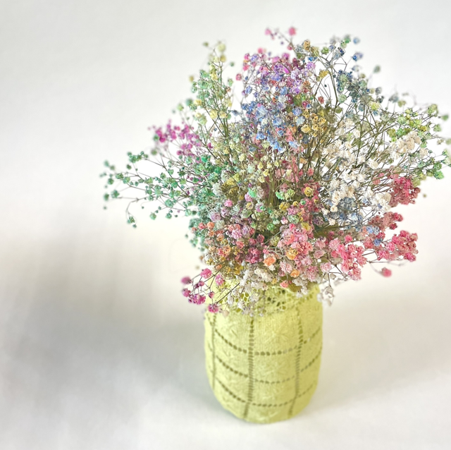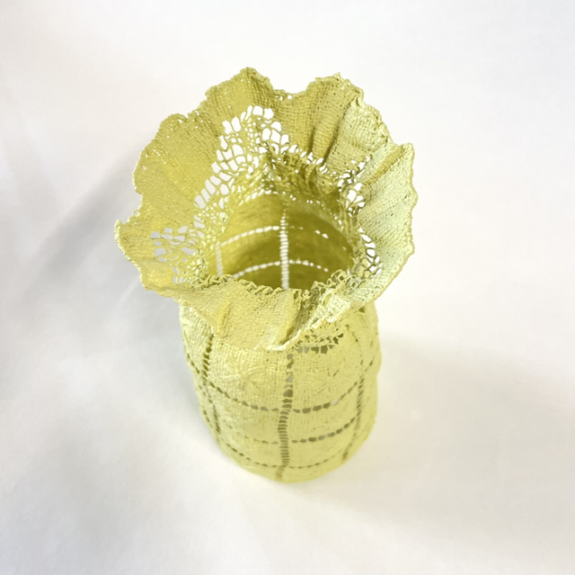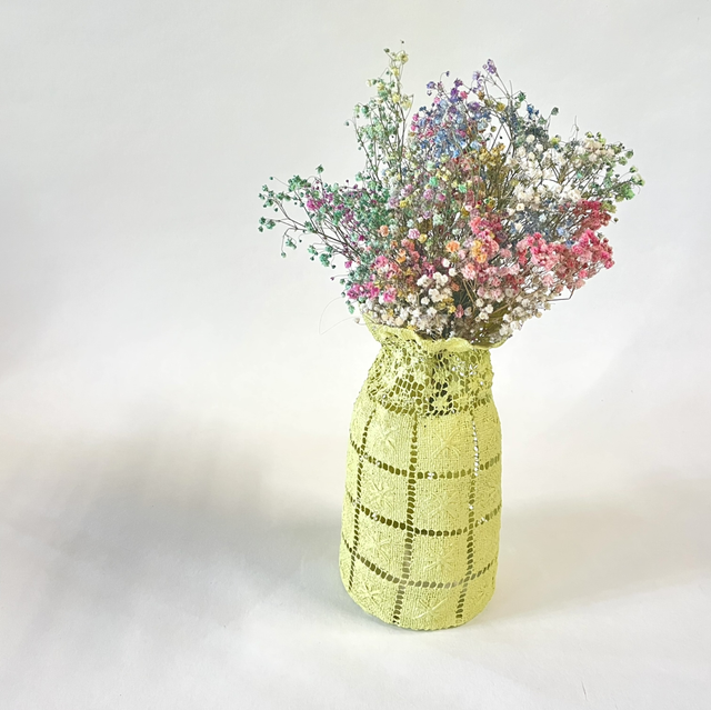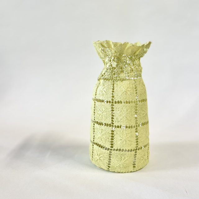 Décoration réalisée à partir d’un napperon durci et peint. Diamètre 12 cm, hauteur 23cm. Pièce unique pour fleurs séchées ou fraîches (Possibilité d’ajouter un contenant d’eau.)