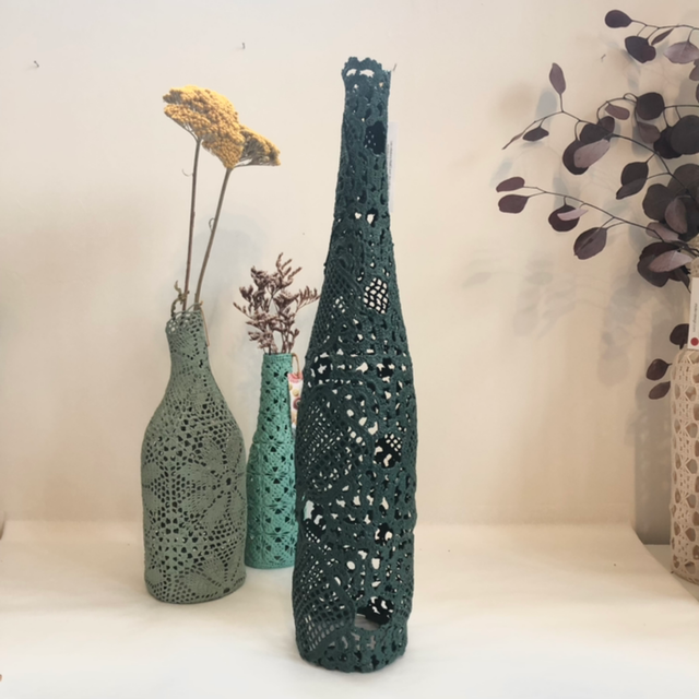 Décoration réalisée à partir d’un napperon durci et peint. Diamètre 9cm, hauteur 47 cm. Pièce unique pour fleurs séchées ou fraîches (Possibilité d’ajouter un contenant d’eau.)