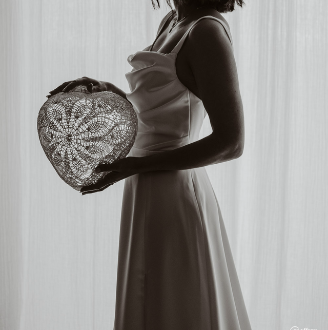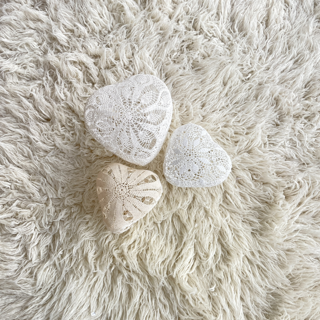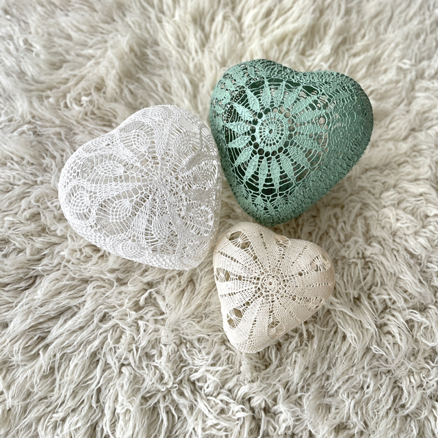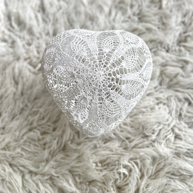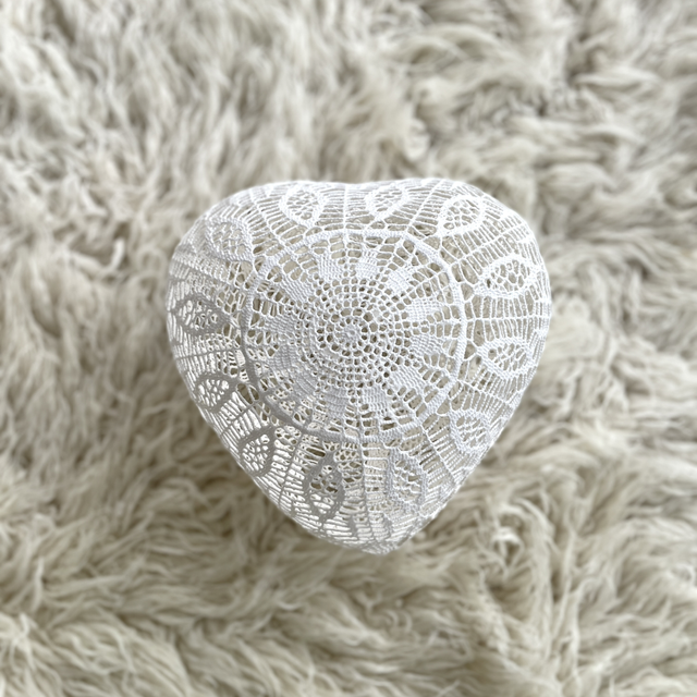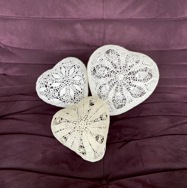 Coeur dentelle Amidonnée - Décoration réalisée à partir de napperons anciens modelés, durcis et peints. Largeur 30 cm. Une jolie preuve d’amour unique. Pour les amoureux de décoration originale.