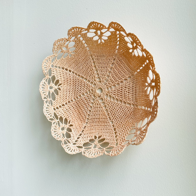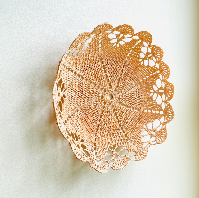 Décoration réalisée à partir d’un napperon durci et peint. Diamètre 23,5cm hauteur 4,5cm.