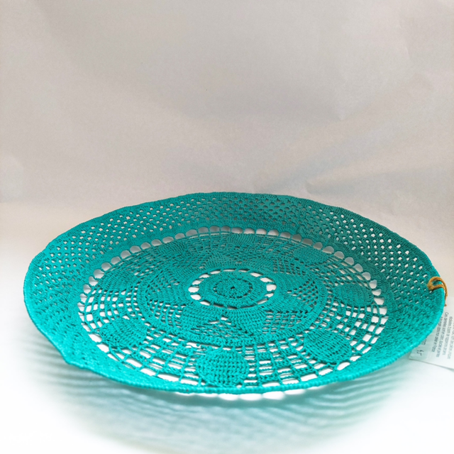 Décoration réalisée à partir d’un napperon durci et peint. Diamètre 29cm hauteur 3,5cm.