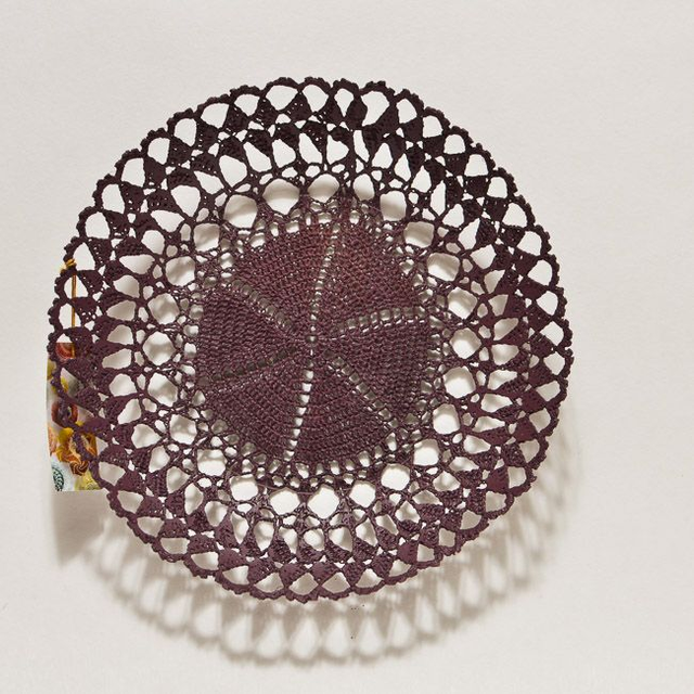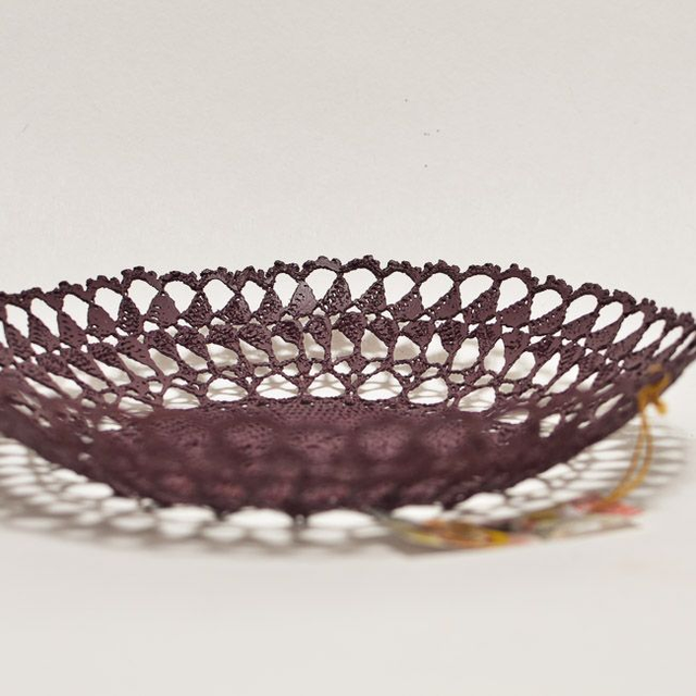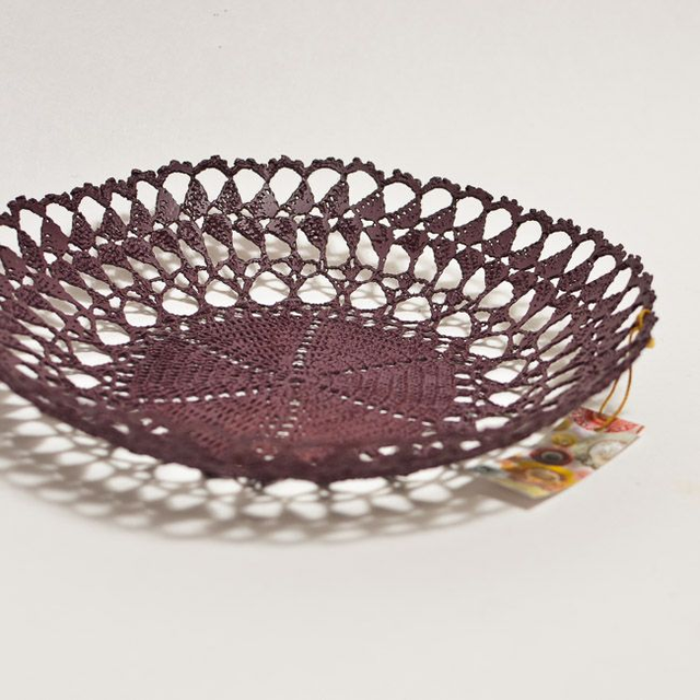 Décoration réalisée à partir d’un napperon durci et peint. Diamètre 24,5cm hauteur 5cm.