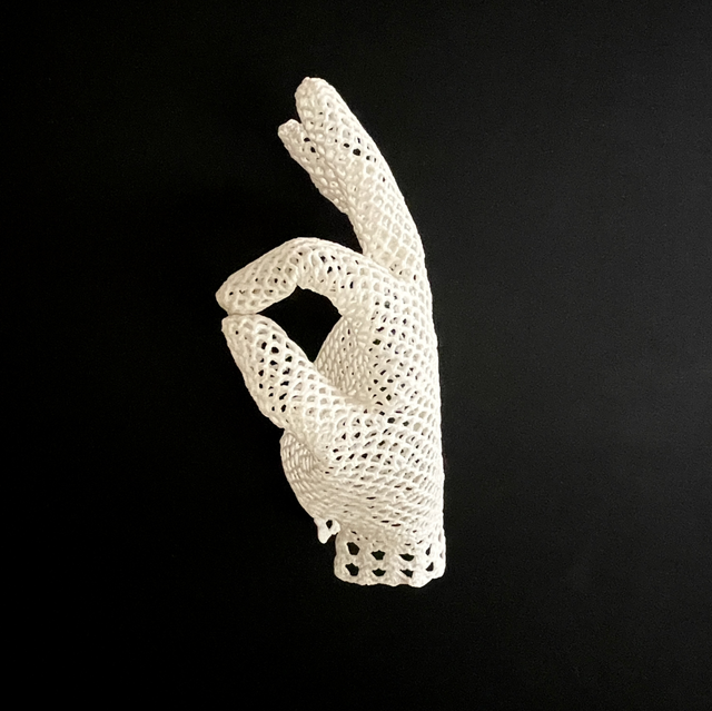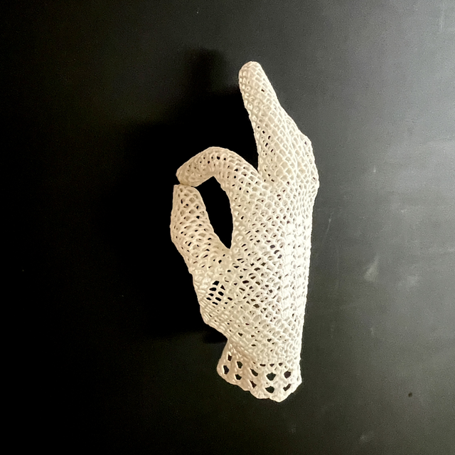 Les émoti(c)ons sont des créations uniques faites à la main dans mon atelier en France. Il est réalisé à partir d'un gant dentelle ancien, modelé, durcit et peint. Hauteur 20 cm. À poser ou fixer au mur avec une petite pointe. Pièce unique. À usage décoratif, à protéger de l’humidité. Coloris blanc.