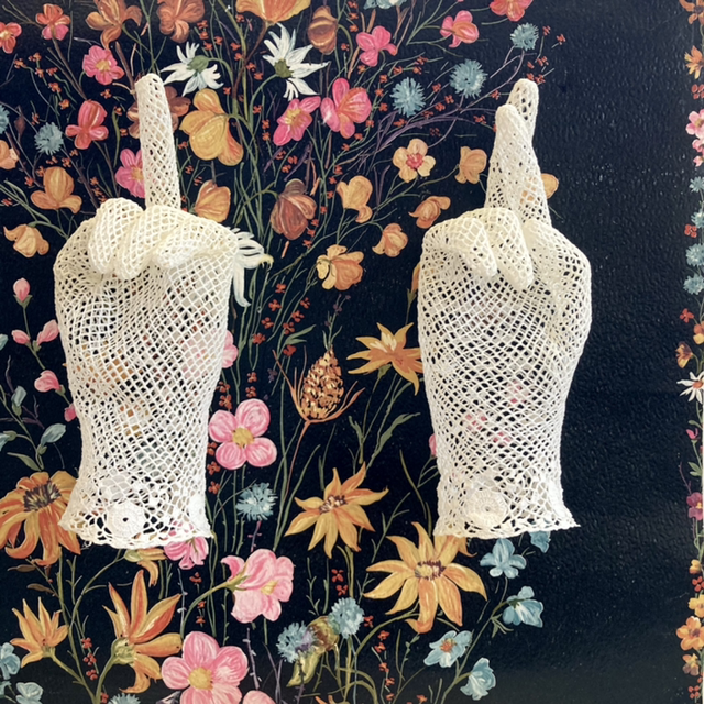 013-Décoration réalisée à partir d’une paire de gants dentelle ancienne, durcie. Hauteur 17cm. À poser ou fixer au mur avec une petite pointe. Pièce unique. À usage décoratif, à protéger de l’humidité.