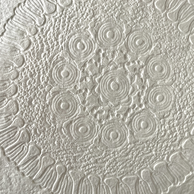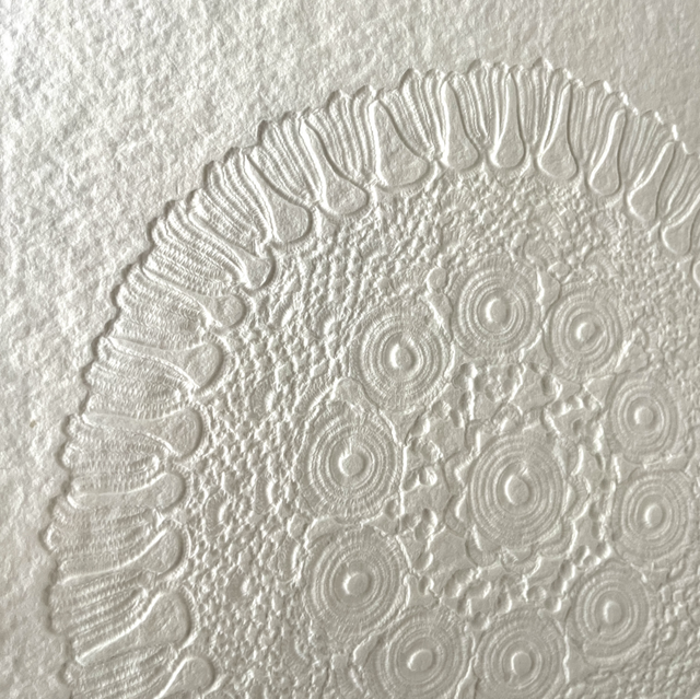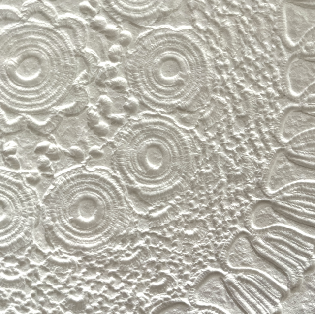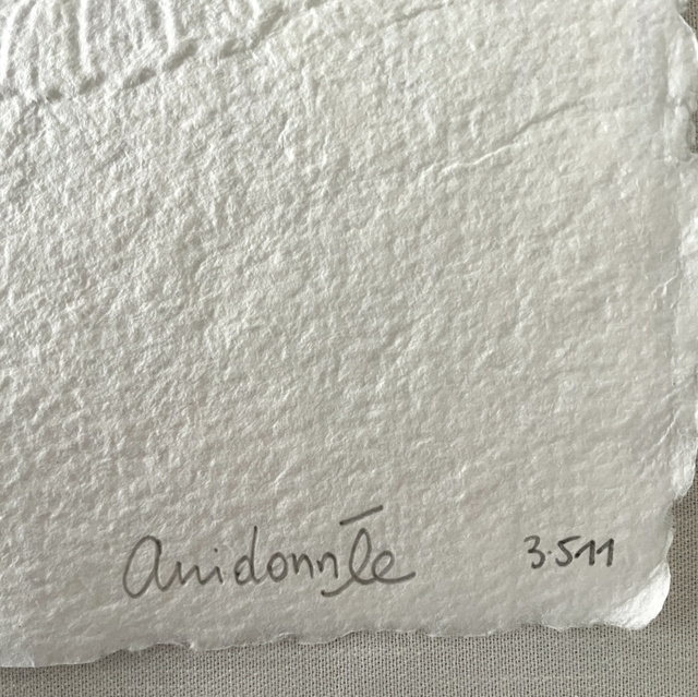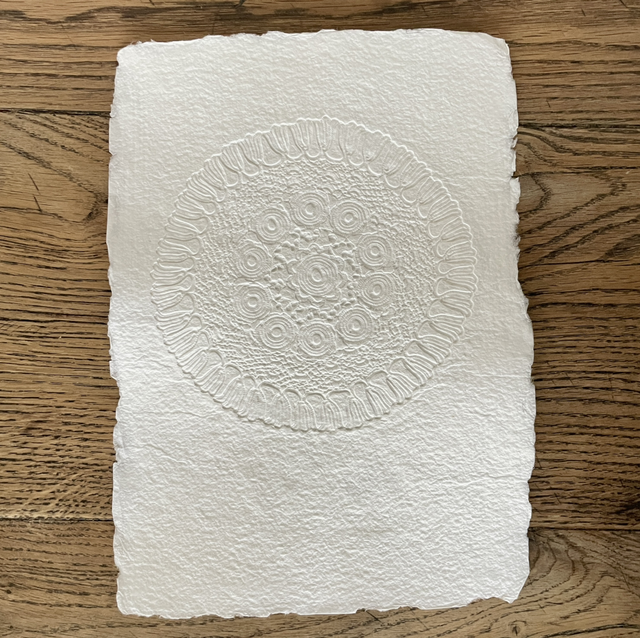 Je porte un nouveau regard sur l’objet avec l’envie qu’il laisse une trace, ses détails graphiques, les textures, comme une empreinte qui révèle des souvenirs. Un napperon posé sur du papier laisse une marque, une ombre, une dentelle en creux. L’embossage du napperon se fait en même temps que la fabrication de la feuille de papier. La fabrication artisanale d’un papier épais et tramé évoque aussi le tissu, la tradition du papier chiffon. On déplace l’objet du quotidien vers le champ artistique, Papier napperon suggère donc l’idée de ce qui reste après le geste, l’impression d’une mémoire textile sur une matière d’écriture.
